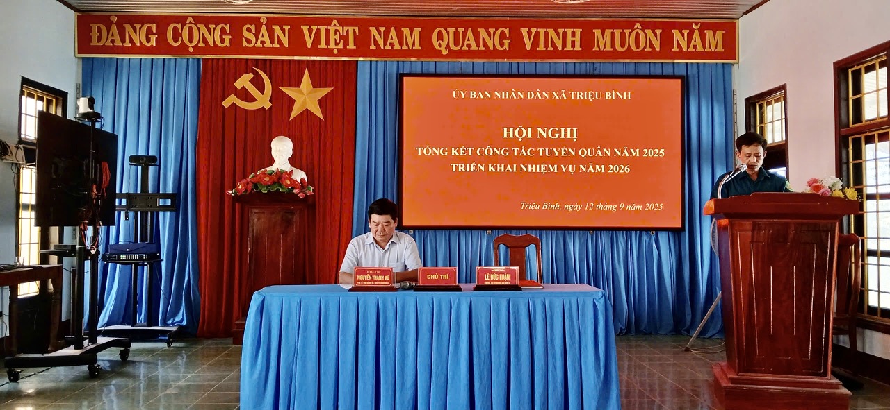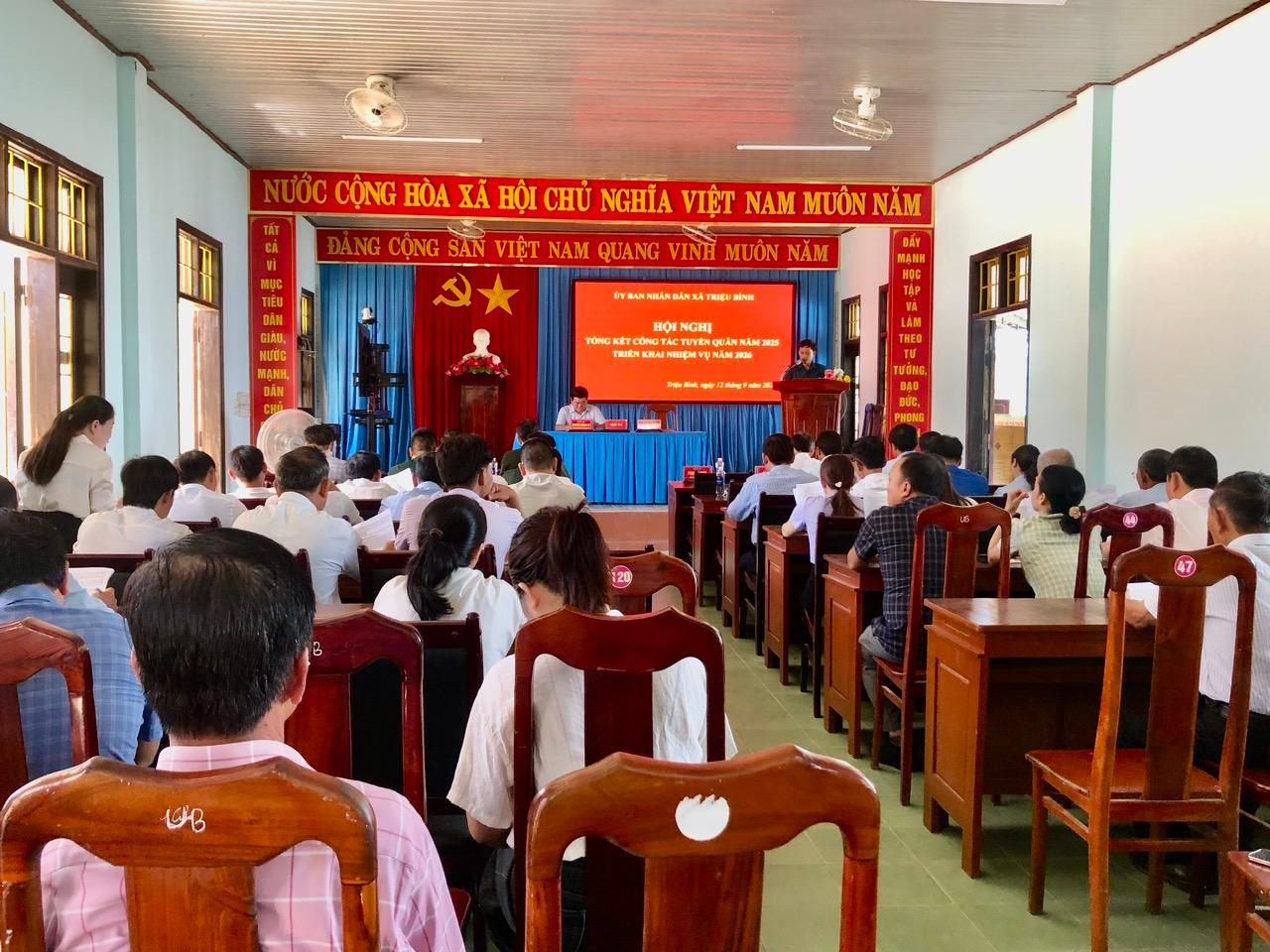 Chiều ngày 12/9/2025, UBND xã Triệu Bình tổ chức Hội nghị tổng kết công tác tuyển chọn, gọi công dân nhập ngũ năm 2025. Hội nghị do đồng chí Nguyễn Thành Vũ, PBT Đảng uỷ, Chủ tịch UBND xã, Chủ tịch hội đồng NVQS xã chủ trì.