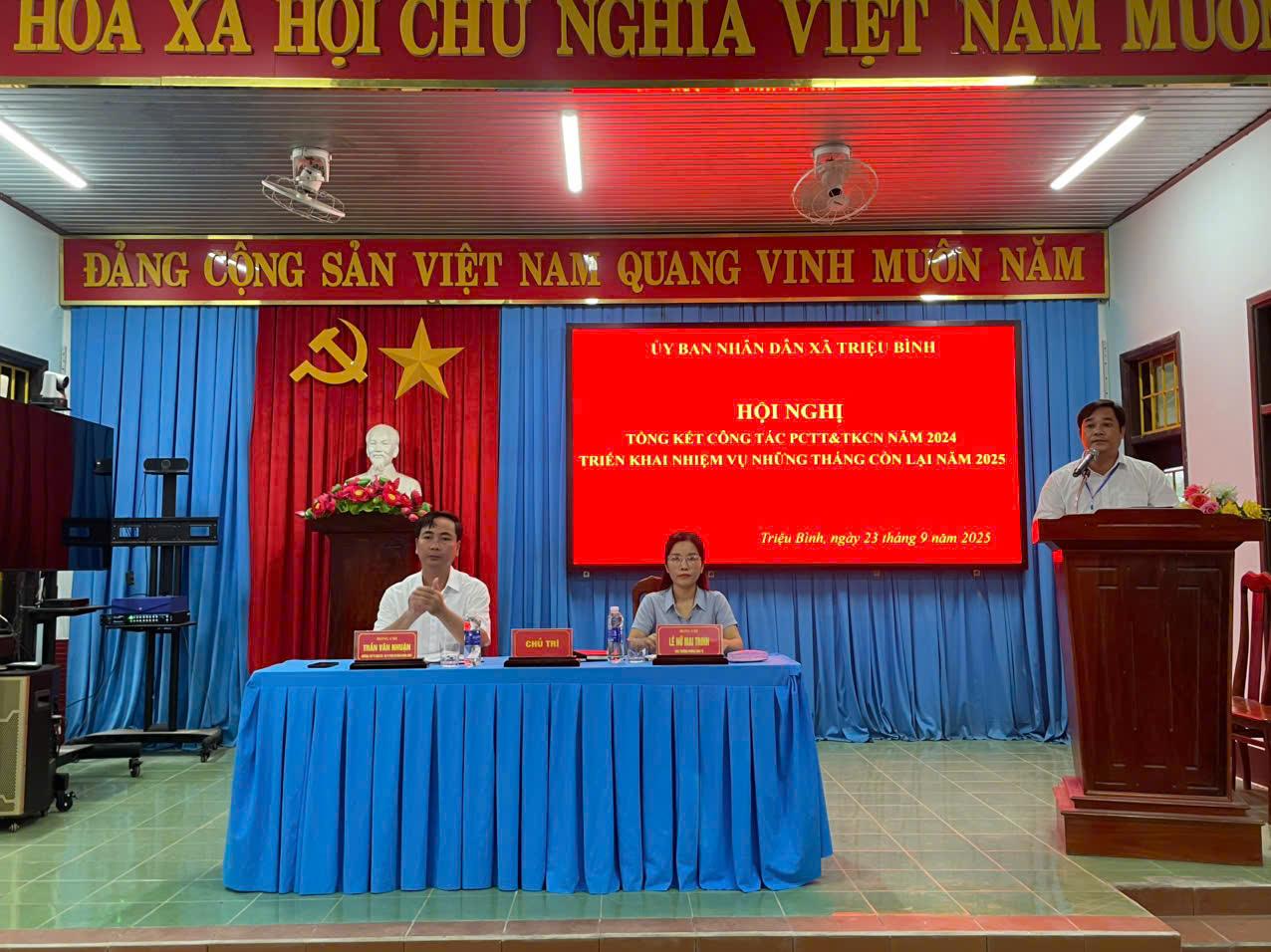 Sáng ngày 26/9/2025, UBND xã Triệu Bình tổ chức Hội nghị tổng kết công tác phòng chống thiên tai, tìm kiếm cứu nạn 2024, triển khai phương hướng nhiệm vụ năm 2025. Tham dự Hội nghị có đồng chí Trần Văn Nhuận- Phó Chủ tịch UBND xã, Trưởng Ban chỉ huy PCTT-TKCN; các đồng chí trong Ban Thường vụ Đảng ủy, Thường trực HĐND, UBND, Ủy ban MTTQ Việt Nam xã; lãnh đạo các cơ quan đơn vị, trường học, các HTX, Bí thư Chi bộ, trưởng các Thôn; Đại diện BGH các trường học; Trạm y tế trên địa bàn xã.