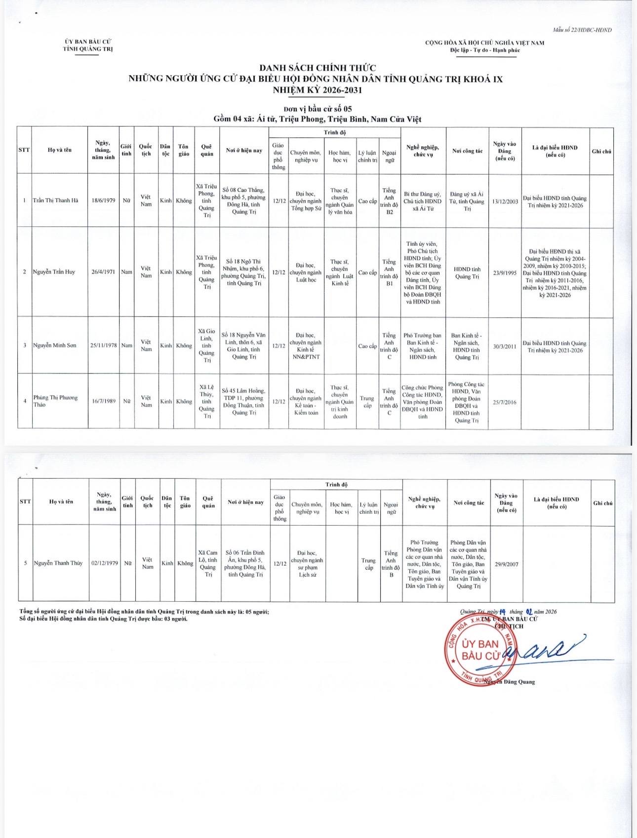 DANH SÁCH CHÍNH THỨC NHỮNG NGƯỜI ỨNG CỬ ĐẠI BIỂU HỘI ĐỒNG NHÂN DÂN TỈNH QUẢNG TRỊ KHOÁ IX NHIỆM KỲ 2026-2031