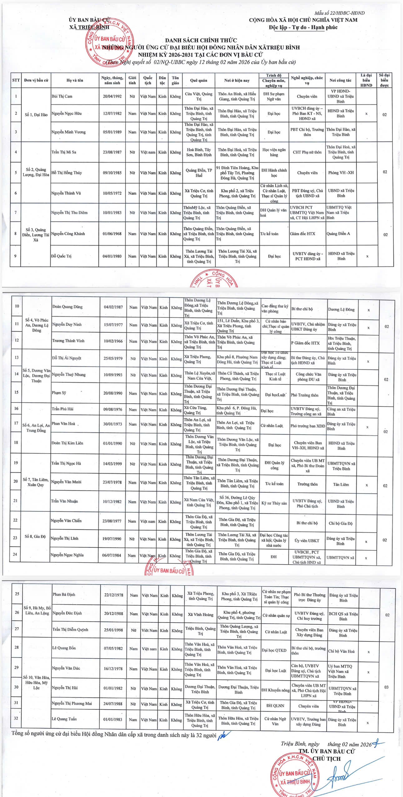NGHỊ QUYẾT CÔNG BỐ DANH SÁCH CHÍNH THỨC NHỮNG NGƯỜI ỨNG CỬ ĐẠI BIỂU HĐND XÃ TRIỆU BÌNH NHIỆM KỲ 2026 - 2031