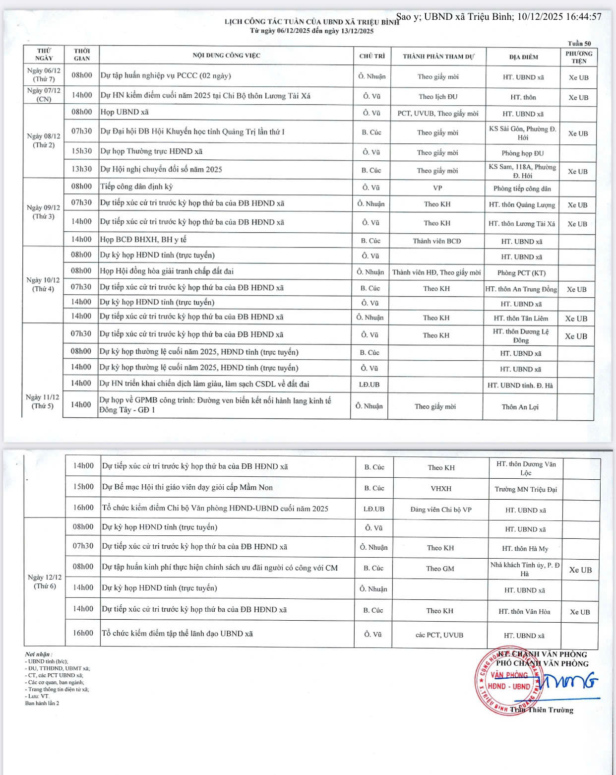 Lịch công tác của UBND xã tuần 50 (ban hành lần 2)