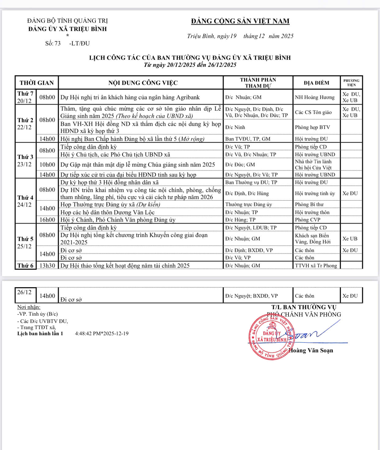 - Lịch công tác của BTV Đảng ủy xã tuần 51 (ban hành lần 4) (19/12/2025)