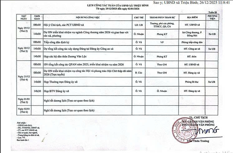 Lịch công tác của UBND xã tuần 53