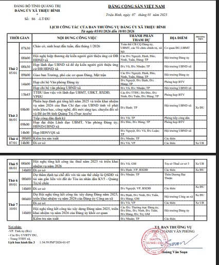 - Lịch công tác của BTV Đảng ủy xã tuần 54 (ban hành lần 2) (06/01/2026)