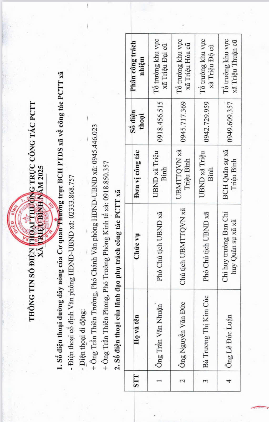THÔNG TIN SỐ ĐIỆN THOẠI THƯỜNG TRỰC CÔNG TÁC PCTT XÃ TRIỆU BÌNH NĂM 2025