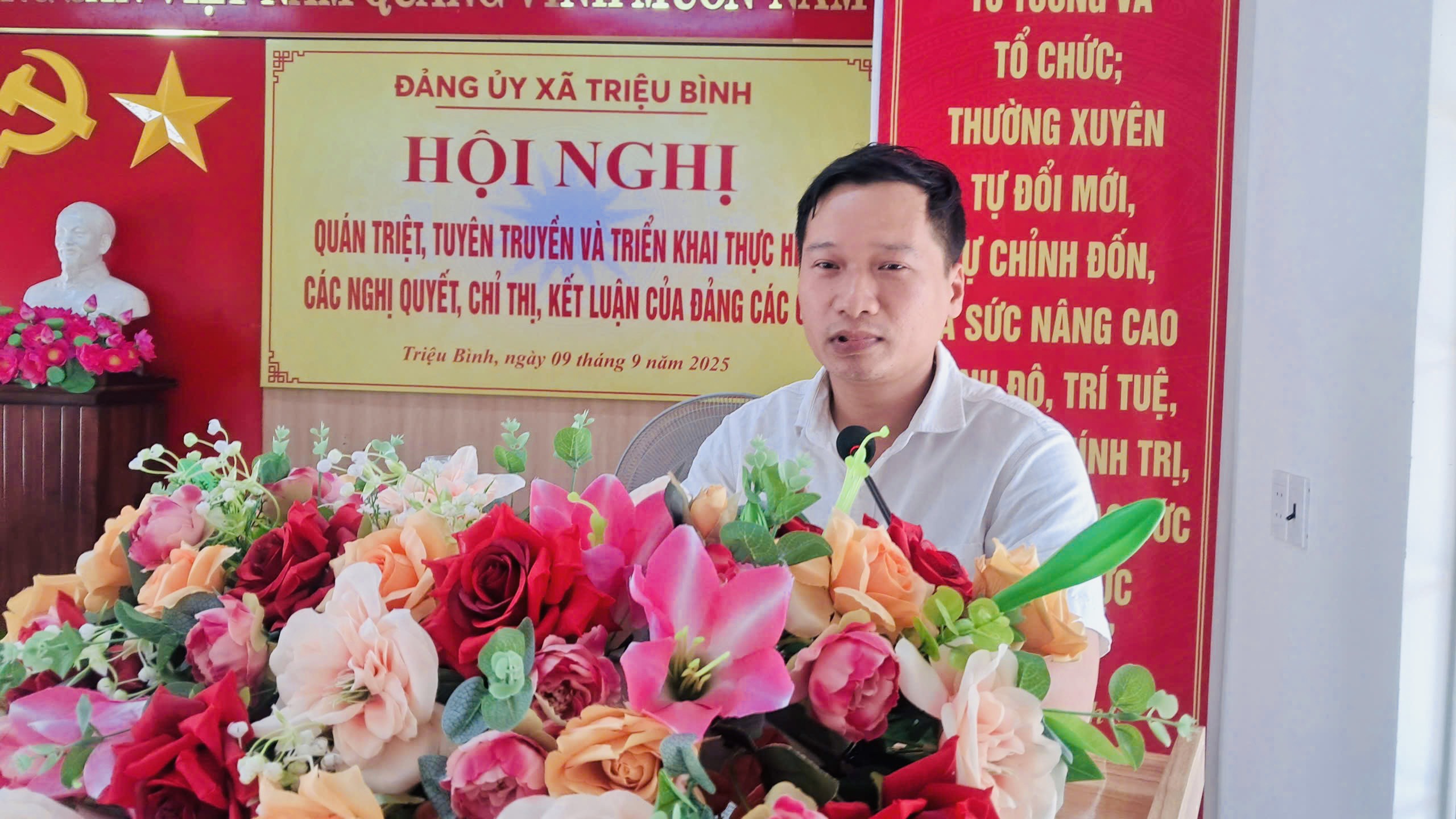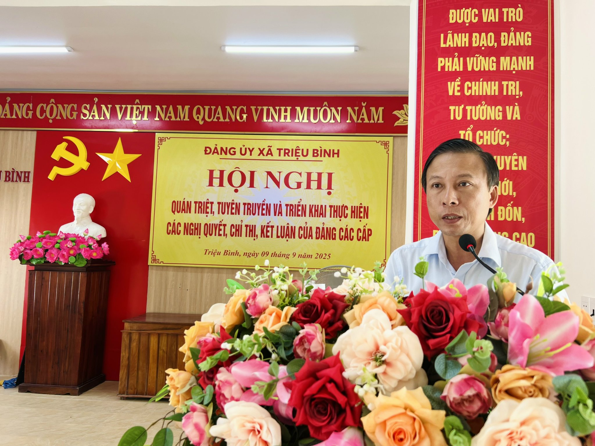 Thực hiện Kế hoạch số 12-KH/TU, ngày 07/8/2025 của Tỉnh ủy, ngày 09/9/2025, Đảng ủy xã Triệu Bình tổ chức Hội nghị học tập, quán triệt, tuyên truyền và triển khai thực hiện các Nghị quyết, Chỉ thị, kết luận của Ban Chấp hành Trung ương Đảng, Bộ Chính trị, Ban Bí thư, Ban Chấp hành Đảng bộ tỉnh và Nghị quyết Đại hộị Đại biểu Đảng bộ xã Triệu Bình lần thứ I, Nhiệm kỳ 2025-2030.