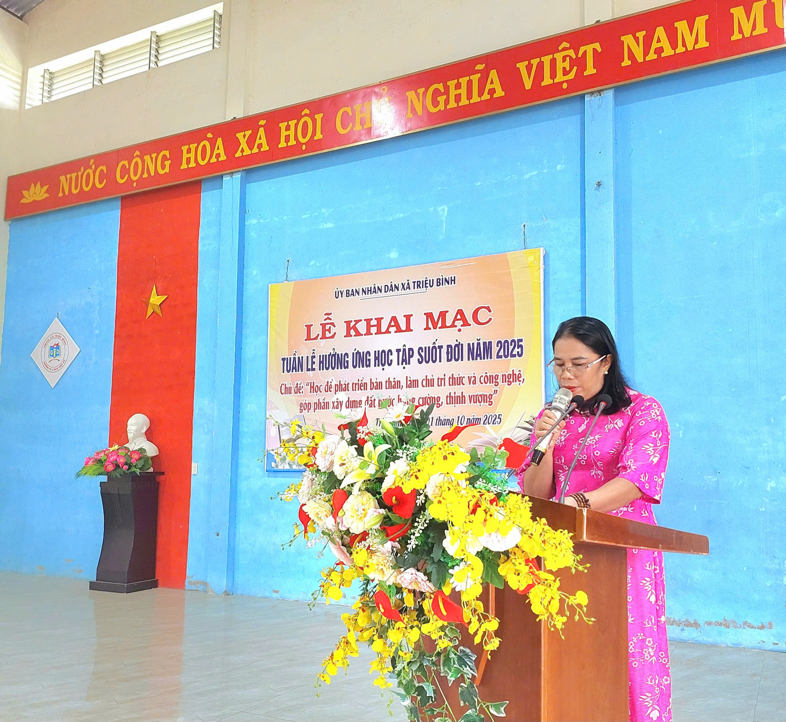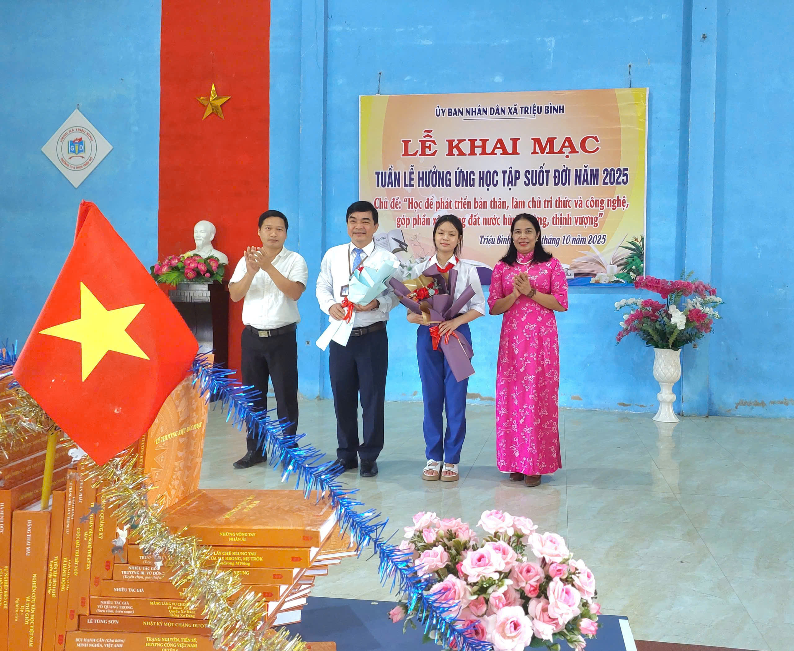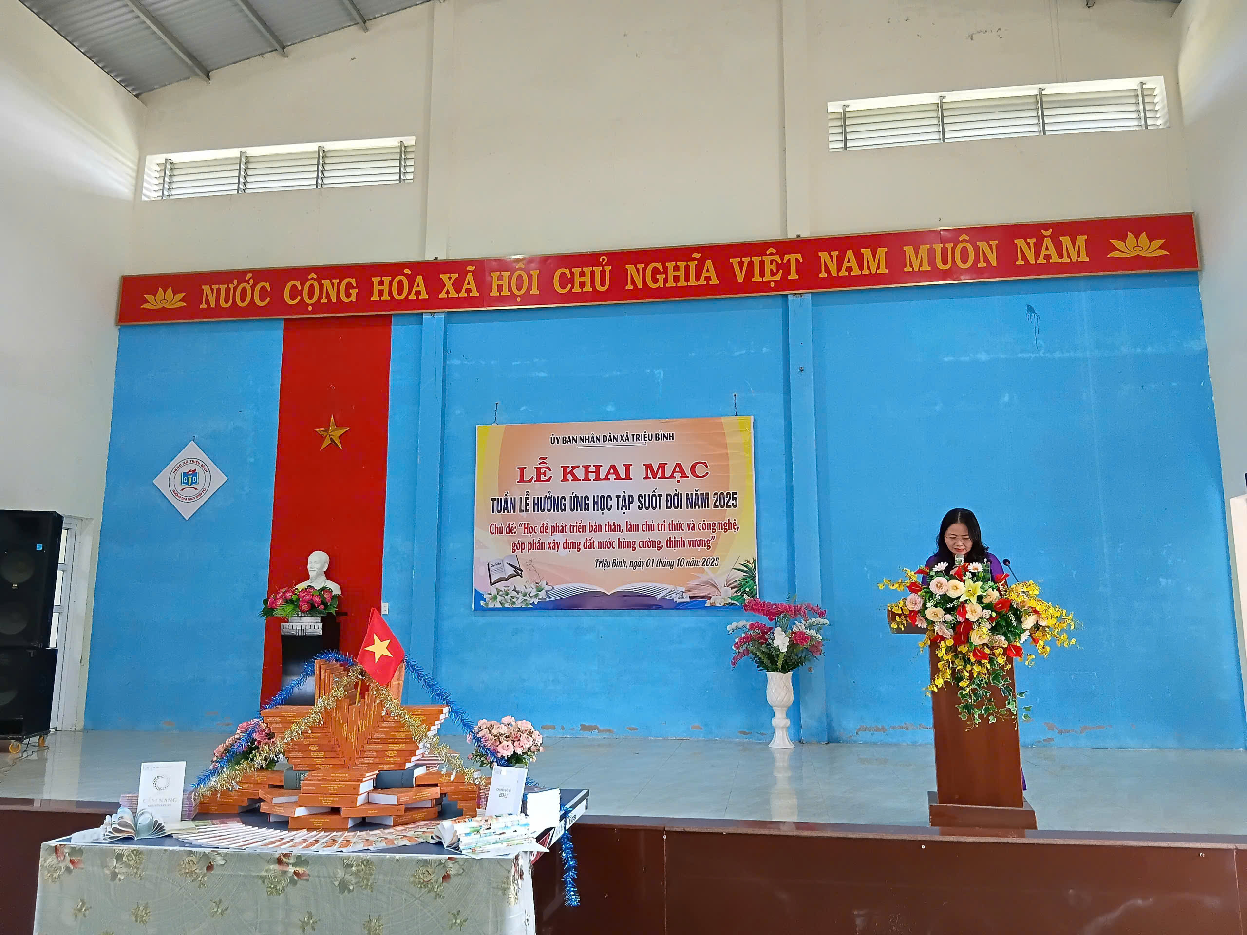 Thực hiện Kế hoạch số 1036/KH-UBND  ngày 22.9.2025 của UBND tỉnh Quảng Trị, Công văn số 1300/ SGDĐT- GDNNTX  ngày 23/9/2025 của sở GD&ĐT tỉnh Quảng Trị, Kế hoạch số 26/KH-UBND ngày 25/9/2025  của UBND Xã Triệu Bình về việc tổ chức Khai mạc Tuần lễ hưởng ứng học tập suốt đời năm 2025, Ủy ban nhân dân xã Triệu Bình đã tổ chức Lễ Khai mạc Tuần lễ hưởng ứng học tập suốt đời năm 2025 với chủ đề: “Học để phát triển bản thân, làm chủ tri thức và công nghệ, góp phần xây dựng đất nước hùng cường, thịnh vượng”.