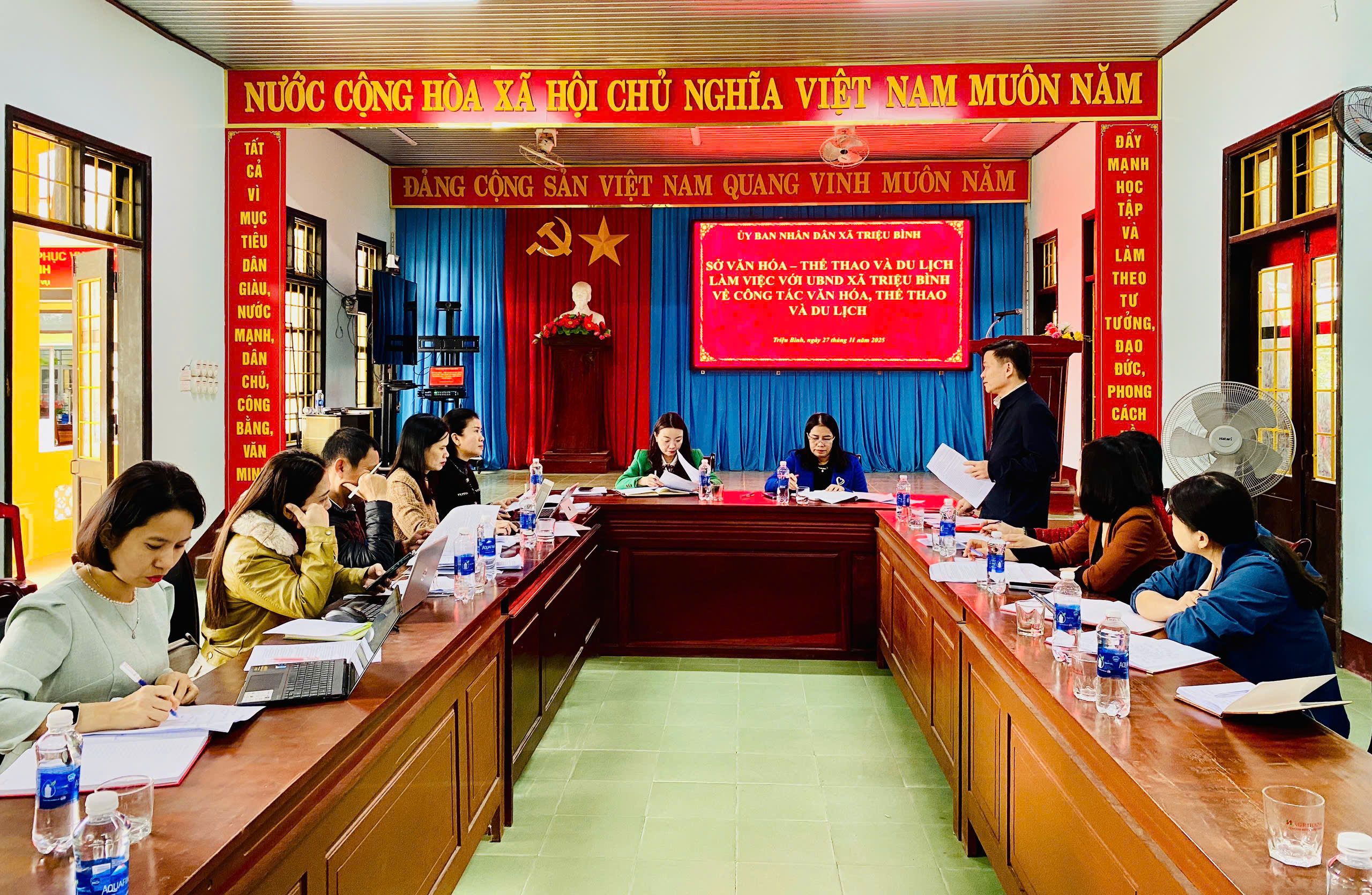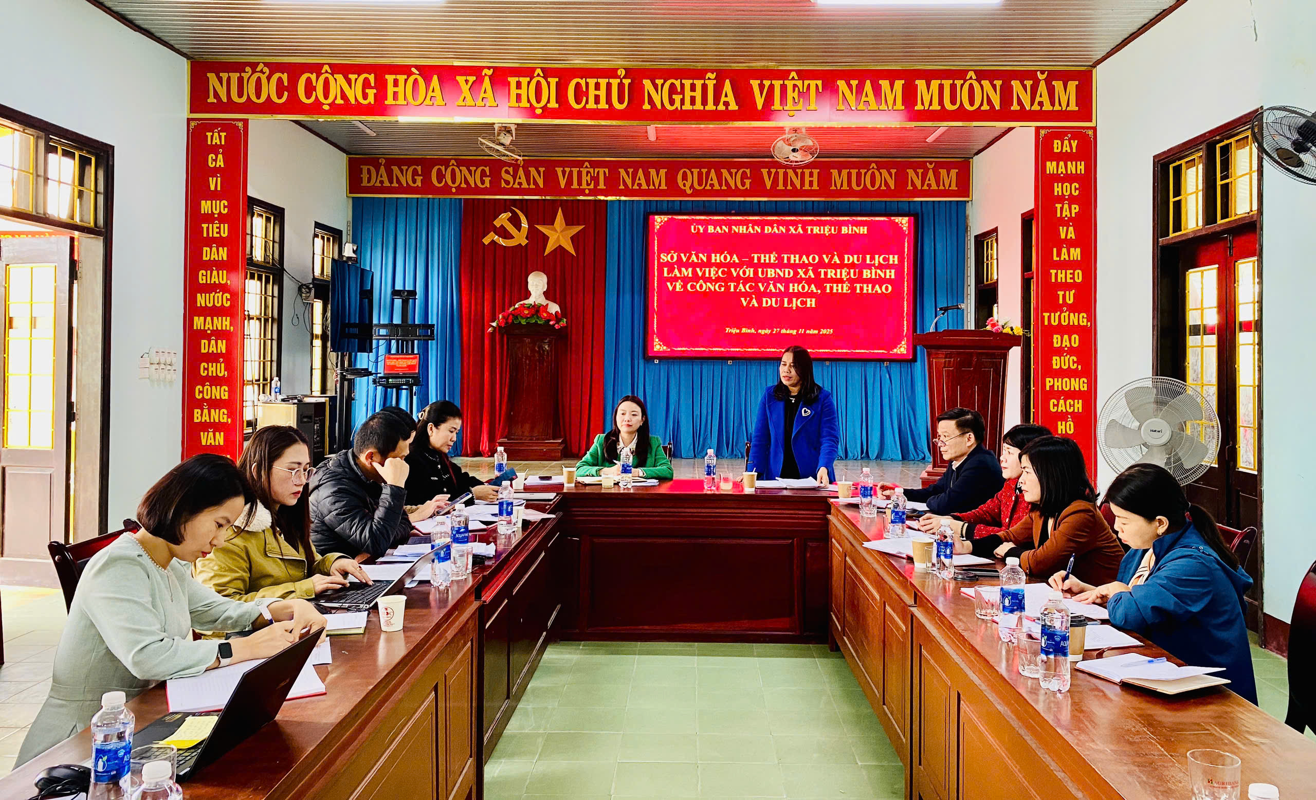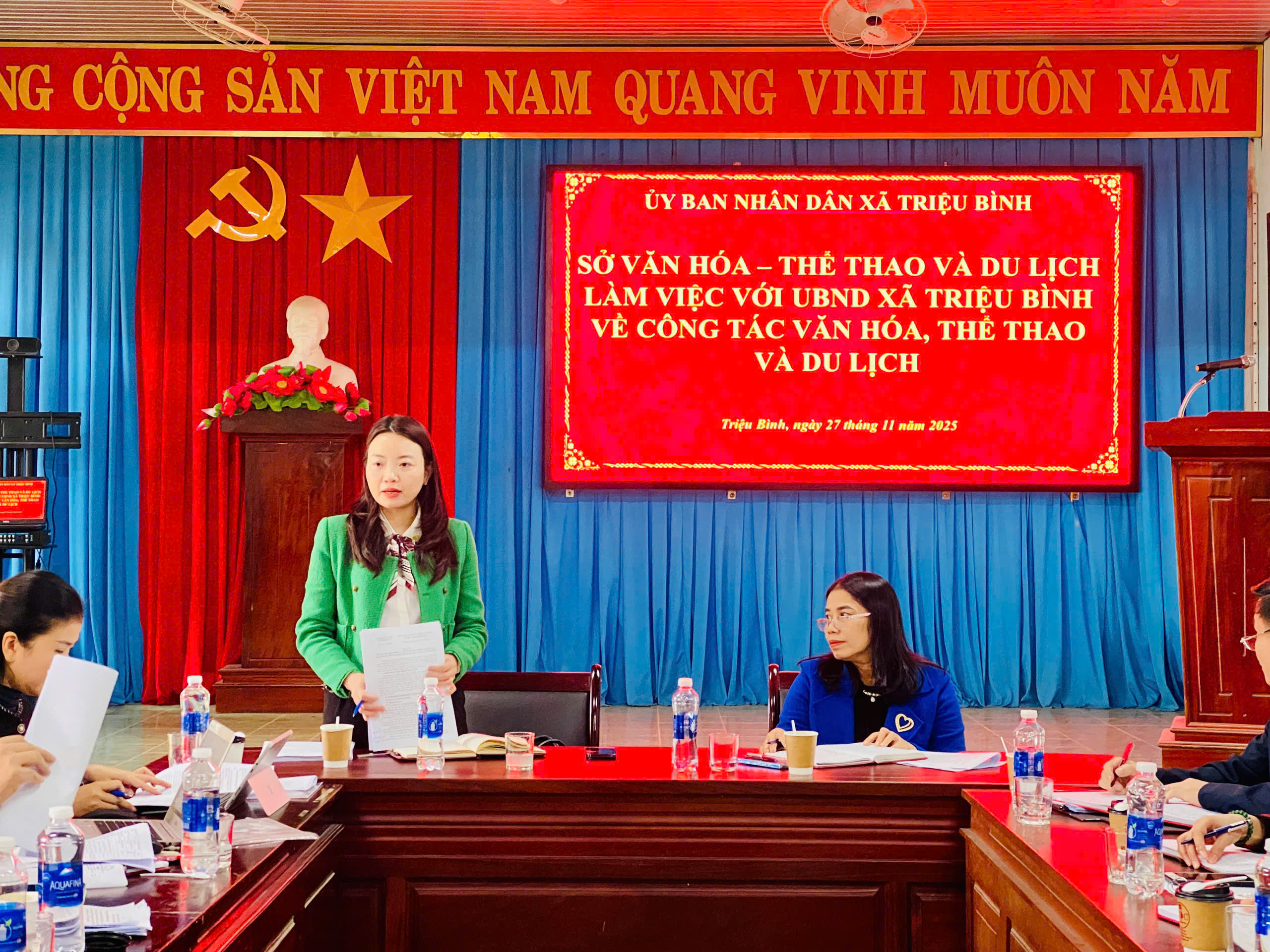 Sáng 27/11, Đoàn công tác của Sở Văn hóa, Thể thao và Du lịch do đồng chí Lê Thị Ngọc Hà - Phó Giám đốc Sở làm trưởng đoàn đã có phiên làm việc với UBND xã Triệu Bình để nắm bắt tình hình thực hiện lĩnh vực văn hóa, thể thao, du lịch, gia đình và báo chí, xuất bản khi triển khai thực hiện các nhiệm vụ theo mô hình chính quyền địa phương 2 cấp. Tham dự phiên làm việc có đại diện lãnh đạo và chuyên viên các phòng chuyên môn thuộc sở. Về phía xã có đồng chí Trương Thị Kim Cúc - ĐUV, Phó Chủ tịch UBND xã; đồng chí Nguyễn Thanh Phong - ĐUV, Trưởng phòng VHXH xã.