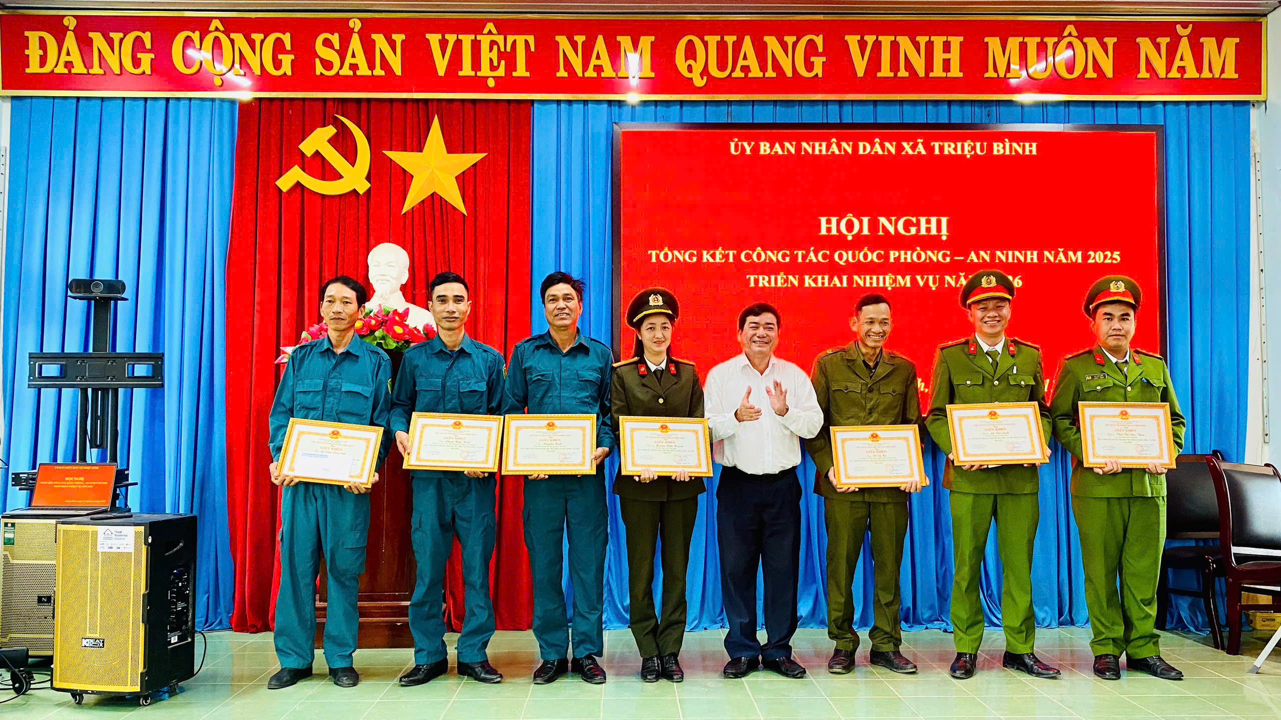 Nhân dịp này, UBND xã Triệu Bình đã trao giấy khen cho 5 tập thể, 17 cá nhân đạt thành tích xuất sắc trong công tác Quốc phòng – an ninh năm 2025.