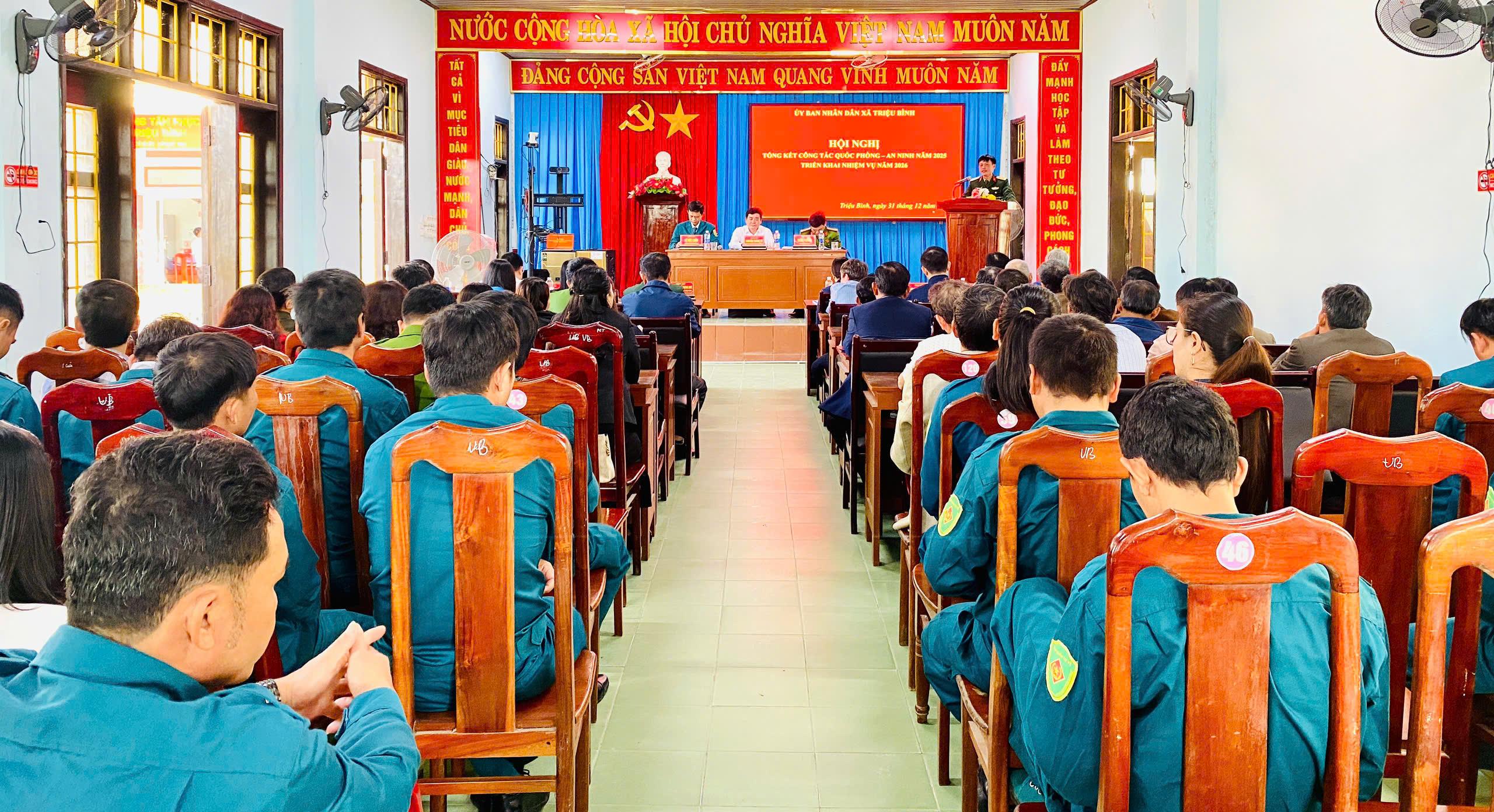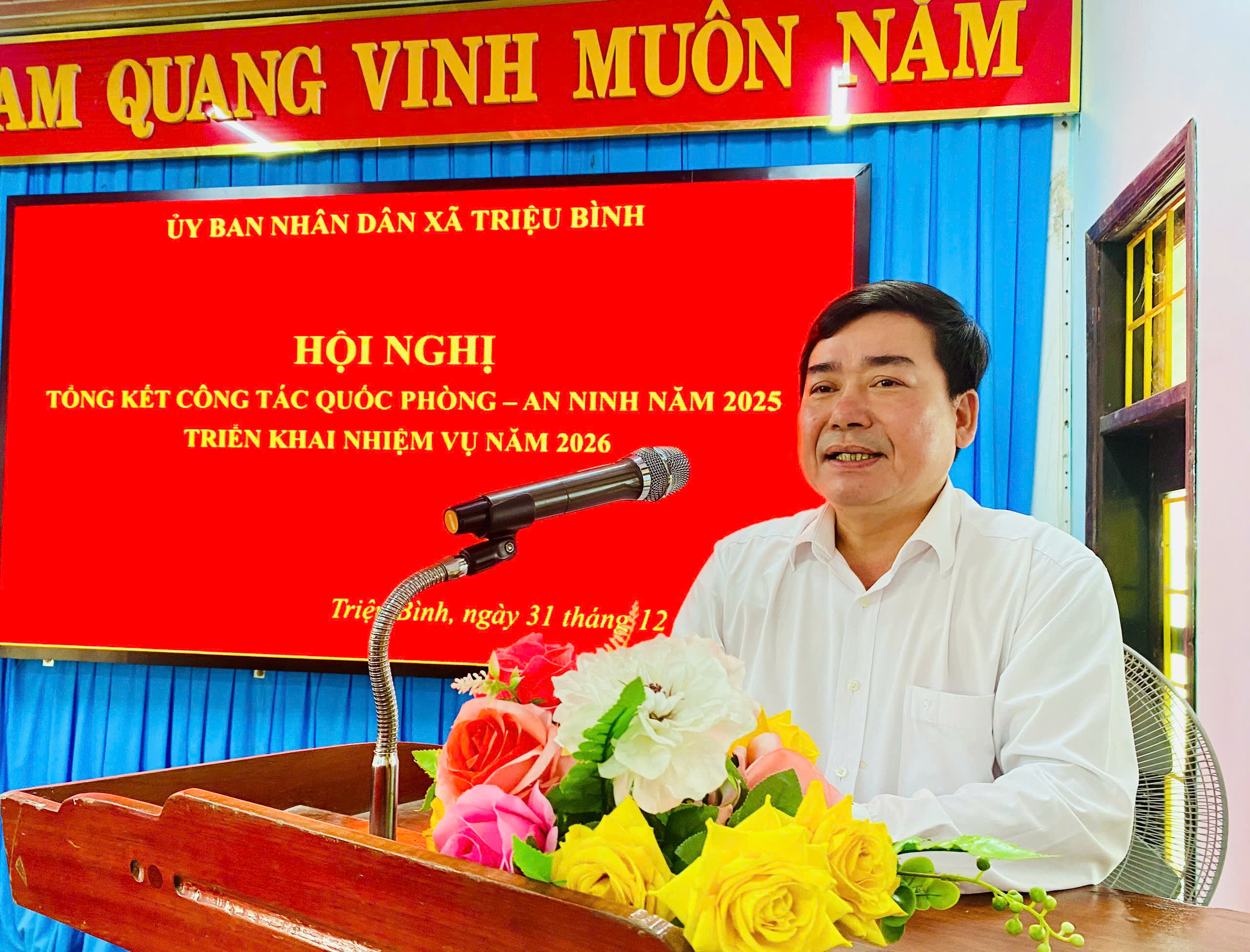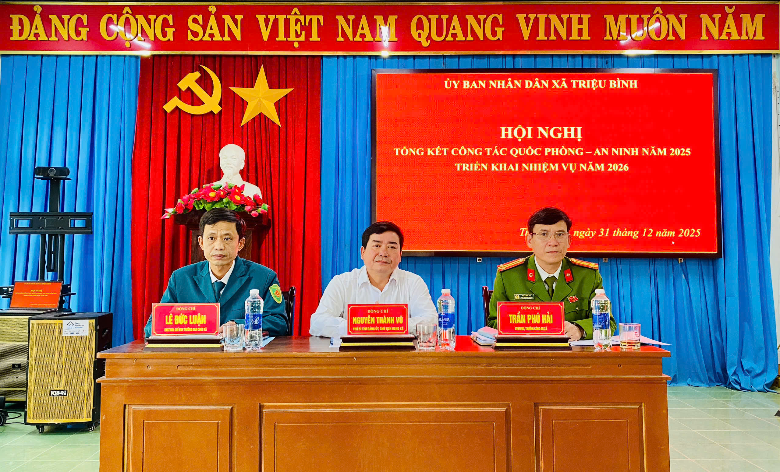 Thực hiện Kế hoạch số 2004/KH-UBND ngày 21/11/2025 của UBND tỉnh Quảng Trị; Kế hoạch 74 /KH-UBND, ngày 19 tháng 12 năm 2025 của UBND xã về tổ chức Hội nghị tổng kết nhiệm vụ quốc phòng, an ninh năm 2025, triển khai nhiệm vụ năm 2026, sáng 31/12, UBND xã Triệu Bình tổ chức Hội nghị tổng kết công tác Quốc phòng – An ninh năm 2025, triển khai nhiệm vụ năm 2026. Đồng chí Nguyễn Thành Vũ – Phó Bí thư Đảng ủy, Chủ tịch UBND xã, đồng chí Trần Phú Hải – UVBTV Đảng ủy, Trưởng Công an xã, đồng chí Lê Đức Luận – UVBTV Đảng ủy, CHT ban CHQS xã chủ trì hội nghị.