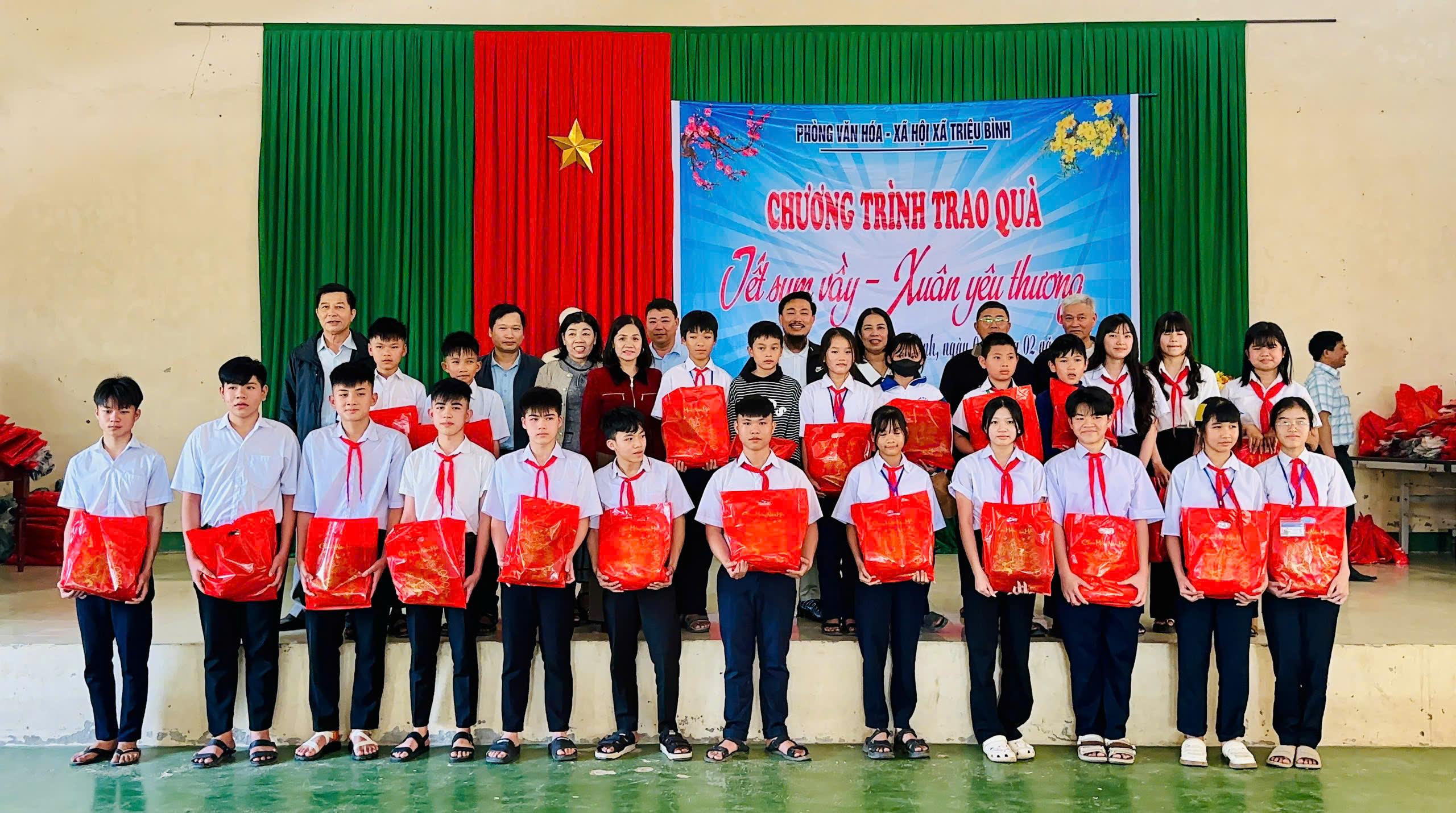Chiều 4/2, Phòng Văn hoá - Xã hội xã Triệu Bình tổ chức chương trình “Tết Sum Vầy – Xuân Yêu Thương”, trao quà cho các hộ gia đình khó khăn trên địa bàn xã. Tham dự chương trình có ông Lê Quang Tuấn - UVBTV Đảng uỷ, Trưởng Ban Xây dựng Đảng đảng uỷ xã; Bà Trương Thị Kim Cúc - Phó Chủ tịch UBND xã; Về phía nhà tài trợ có ông Hồ Sỹ Khoa cùng gia đình.