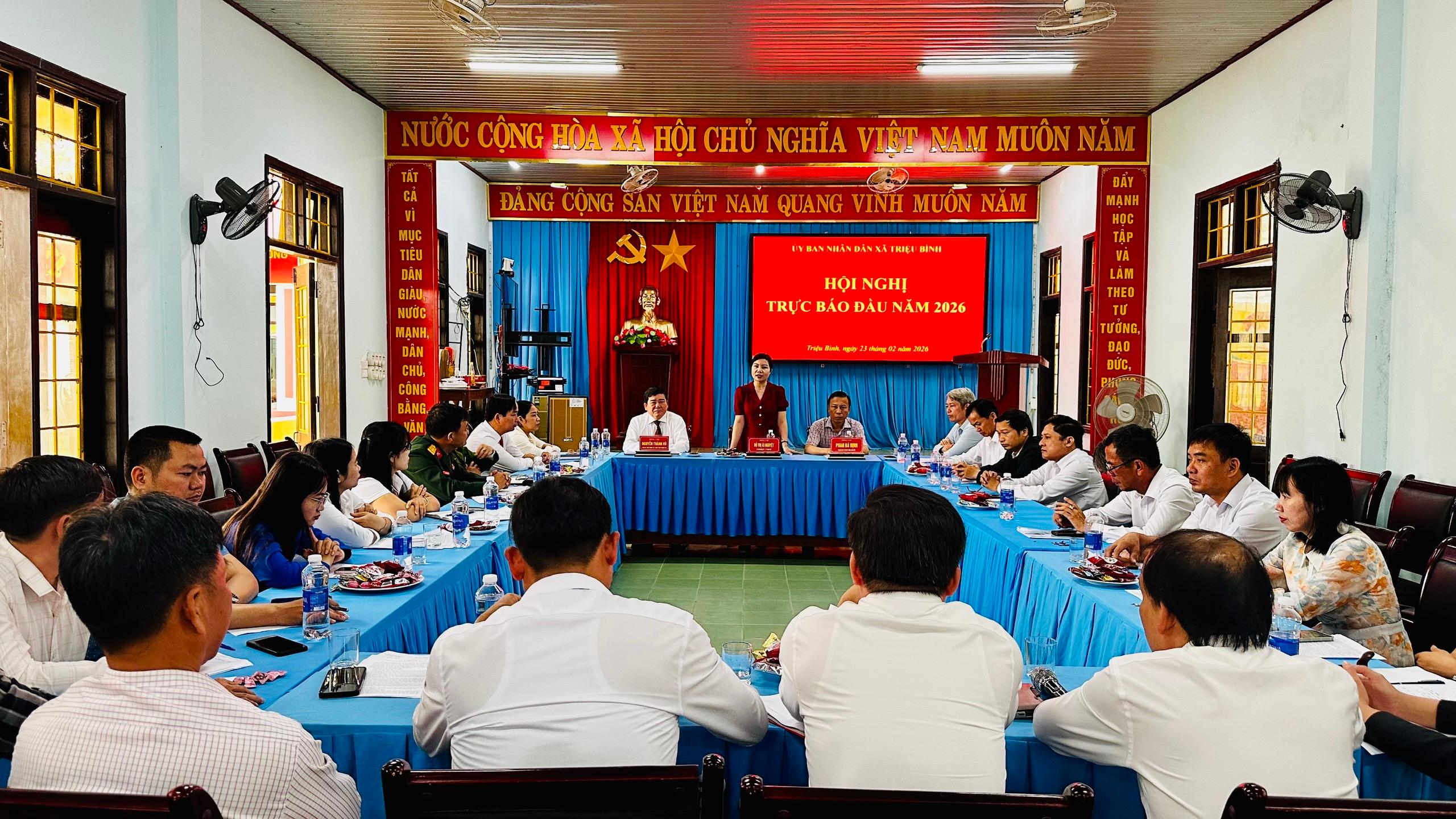 Sáng nay, 23/2, UBND xã Triệu Bình tổ chức hội nghị trực báo đầu năm 2026 nhằm đánh giá tình hình tổ chức tết Nguyên đán Bính Ngọ, triển khai các nhiệm vụ trong thời gian tới. Tham dự hội nghị có đồng chí Đỗ Thị Ái Nguyệt – Bí thư Đảng ủy, Chủ tịch HĐND xã; Đồng chí Phan Bá Định – Phó Bí thư Thường trực Đảng ủy xã; Đồng chí Nguyễn Thành Vũ – Phó Bí thư Đảng ủy, Chủ tịch UBND xã; Đồng chí Nguyễn Văn Đức – UVBTV Đảng ủy, Chủ tịch UBMTTQ Việt Nam xã cùng các đồng chí trong BTV Đảng ủy, Thường trực HĐND, UBND, UBMTTQ Việt Nam xã, lãnh đạo các cơ quan, ban, ngành, đoàn thể xã.